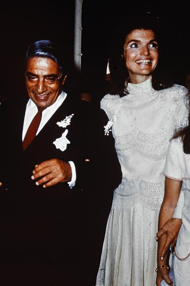 Jacqueline Kennedy contrajo matrimonio con Aristóteles Onassis en 1968 y, de la mano de Valentino, lució un vestido de novia muy diferente al diseño clásico que había llevado en su boda con John F. Kennedy. En esta ceremonia de segundas nupcias la que fuera primera dama de EE.UU. se vistió de corto con un elegante diseño de encaje color marfil, sin mangas, cuello alto y falda tableada.