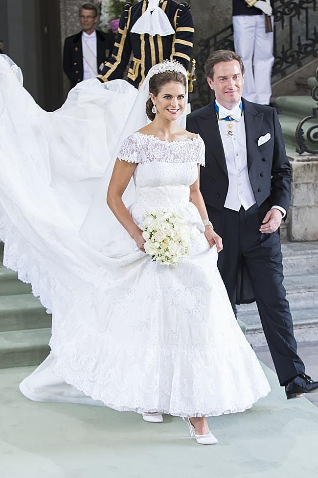 El vestido de novia de Magdalena de Suecia es en la actualidad uno de los diseños nupciales más copiados. La princesa se casó en 2013 con un espectacular diseño de Valentino confeccionado en organza de seda plisada y con un favorecedor y delicado escote barco adornado con encaje de Chantilly. De blanco impoluto, llevaba una falda amplia con pliegues y una cola de cuatro metros que fluía majestuosamente y un largo velo de organza coronado por una tiara.