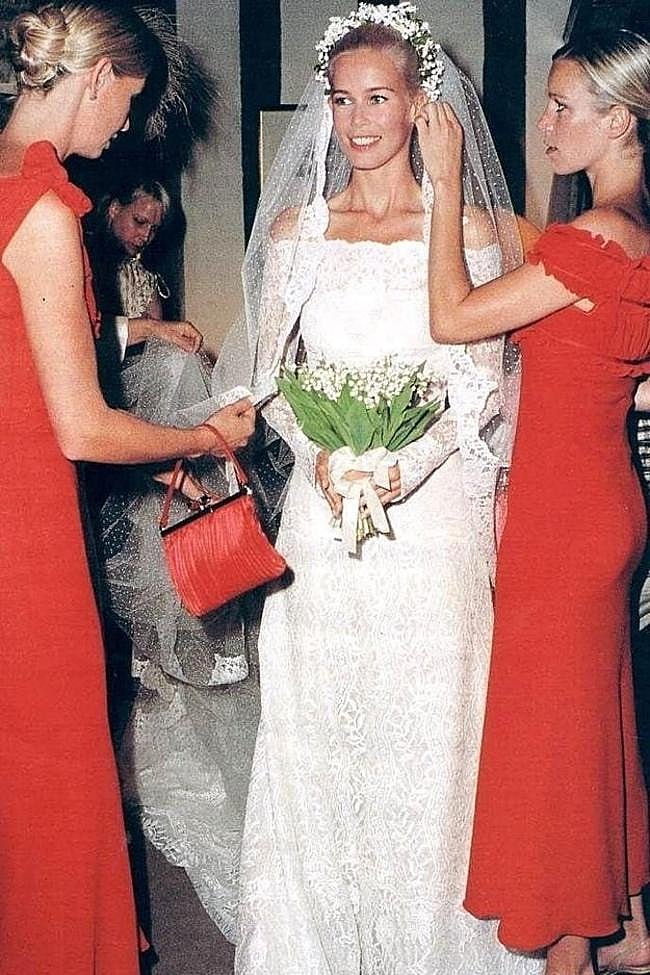 El vestido de novia de Claudia Schiffer, diseñado por Valentino para su boda en 2002, fue un impresionante diseño de alta costura blanco, ceñido hasta las caderas, con manga larga y escote pronunciado que pasó a la historia por estar elaborado con cuatro tipos de encaje hechos a mano. Además, presentaba una cola de cuatro metros que iba acompañada de un velo de cinco metros adornado por una corona de flores.