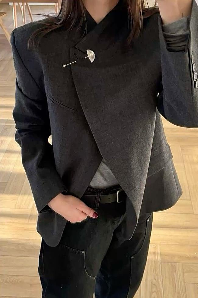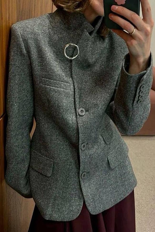 Un tip para convertir la americana en una chaqueta de cuello subido que recuerda a la tendencia de las chaquetas de nudo de rana y que es todo un acierto, sobre todo, si le añades un broche. Algunas creadores de contenido y prescriptoras de estilo han probado este truco que eleva al completo esta propuesta.