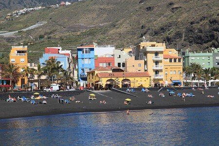 Mientras los turistas extranjeros se acumulan en la zona sur de Gran Canaria y Tenerife, La Palma queda más olvidada. Si bien es cierto que esta isla volcánica es casi toda de acantilados y roca, en la zona oeste esconde un pueblito idílico con una playa negra imponente. En Tazacorte tendrás calor, tendrás casas de colores e incluso podrías ver ballenas y delfines. Viene con garantía de éxito, porque es el pueblo con más horas de sol de toda España.
