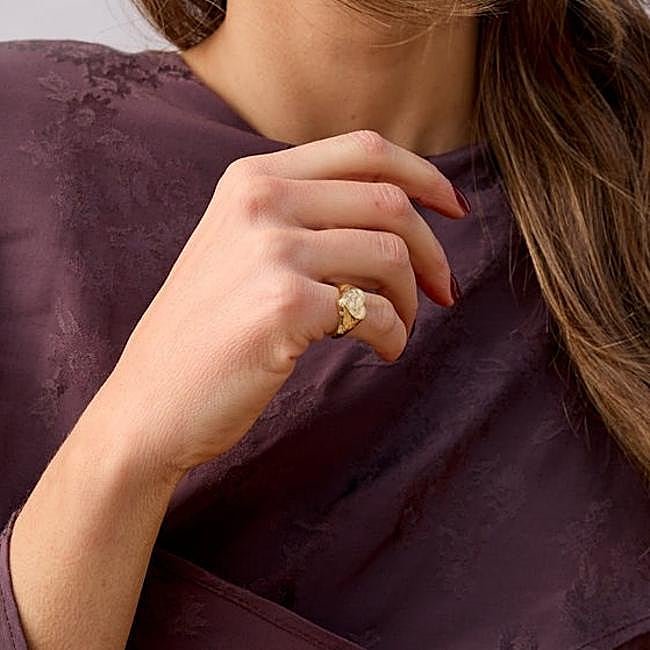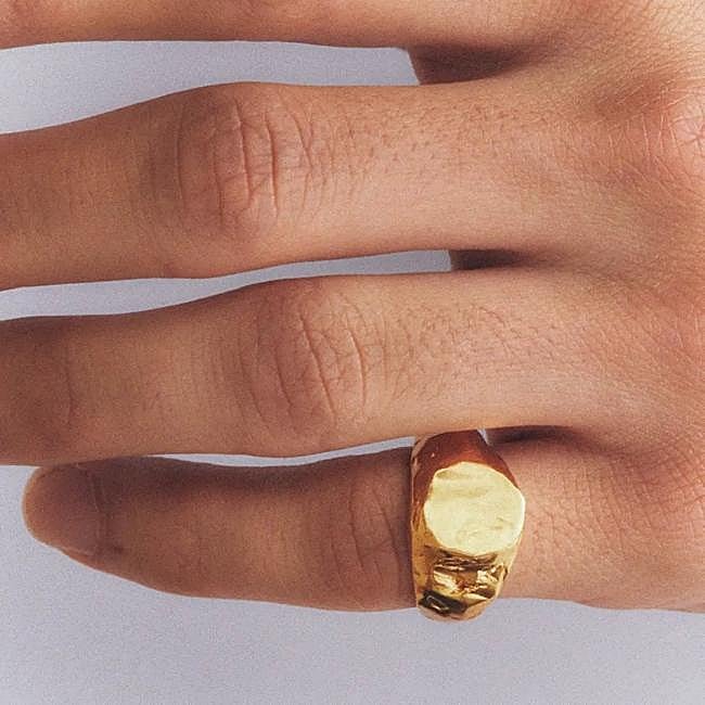 El sello Soye de Simuero es un anillo artesanal de plata de ley 925 reciclada bañado en oro de 18K. Destaca por un diseño efecto arrugado o desgastado tan característico de la firma. Precio: 190 euros.