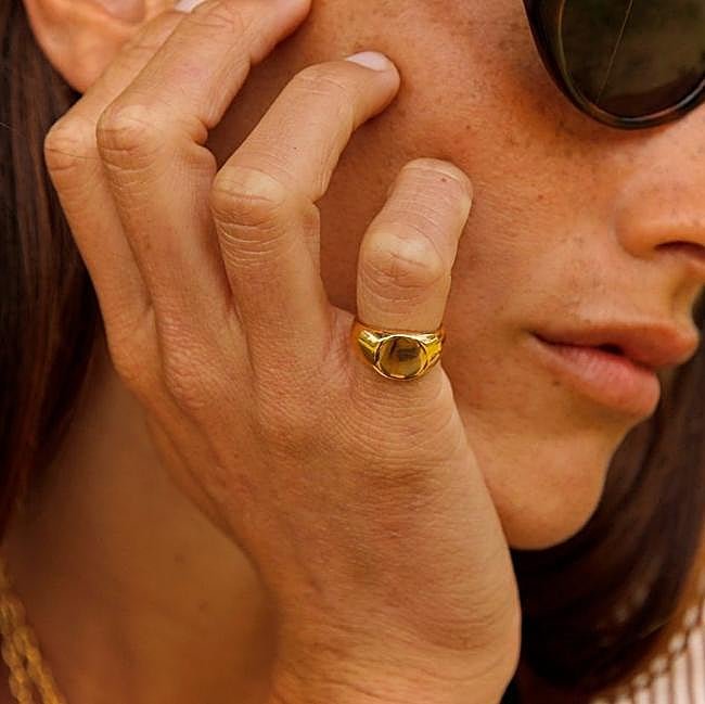 El anillo sello mini Amore de Alhaja es un sello perfecto para el dedo meñique, con letras romanas y un mensaje claro e importante en la vida: amor en italiano. Está bañado en 3 micras de oro de 18k para que dure más tiempo como el primer día. Precio: 69 euros.