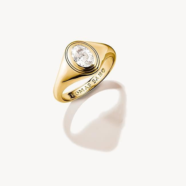 Este anillo de plata 925 reciclada en oro de 18k de Thomas Sabo apuesta por una presencia sobria y un estilo máximo. La circonita blanca en talla oval se integra en una montura tipo chatón reducida, que aporta un brillo discreto pero muy efectivo. Precio: 129 euros.