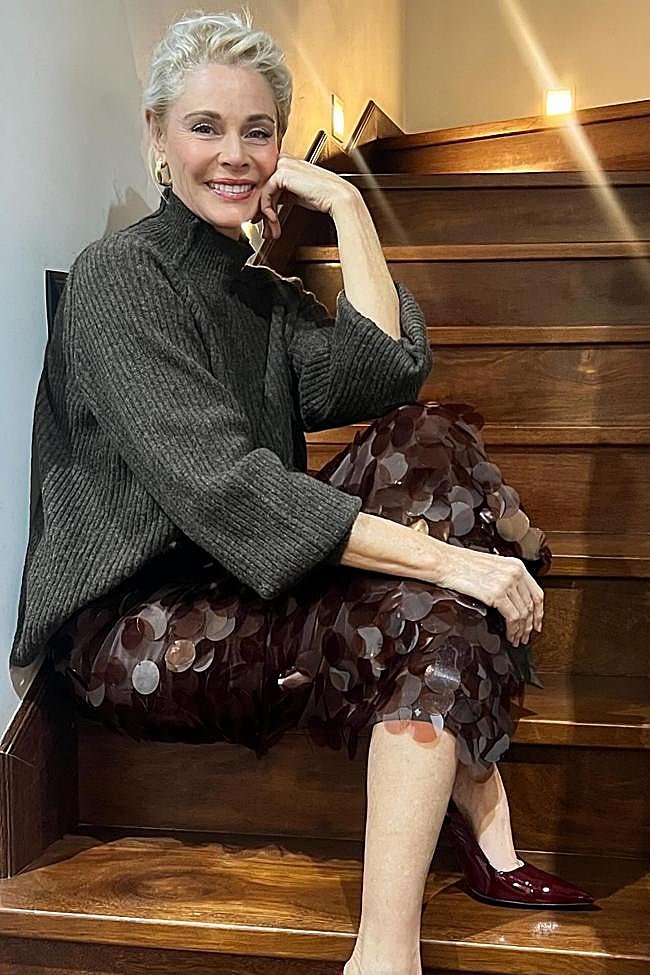 Para esta ocasión tan mediática, la actriz escogió una de las fórmulas más repetidas en los últimos meses cuando se trata de conseguir un look elegante pero abrigado: la combinación de falda midi de lentejuelas con un jersey de punto, ambas prendas en el mismo color.