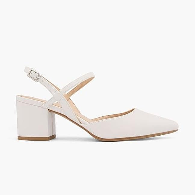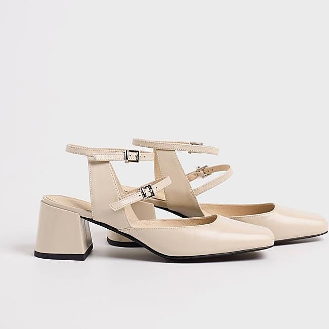 Por último, una propuesta más moderna: la de Mim. Es un zapato de tacón en piel color ecru con la parte delantera cerrada cuadrada y tiras en el empeine y el tobillo con cierre de hebilla. Tiene la parte de atrás destalonada con tacón cuadrado y cuestan 49,99 euros.