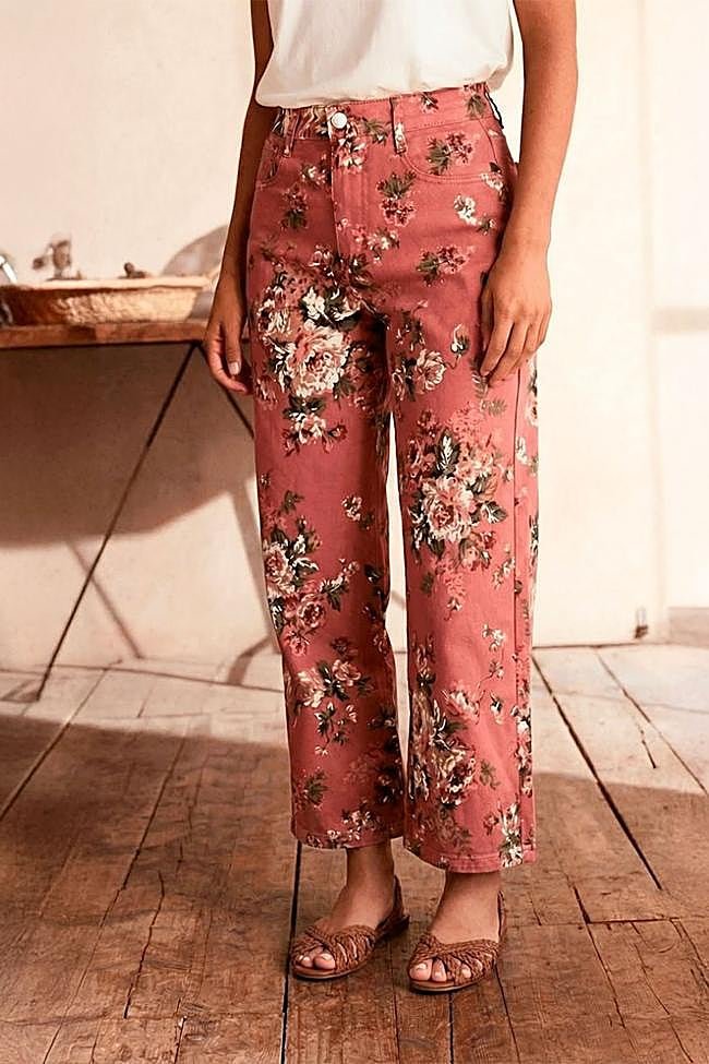 Pantalón estampado de flores en color maquillaje, con un diseño de tiro alto y bolsillos en la parte frontal. Precio: 59,95 euros.