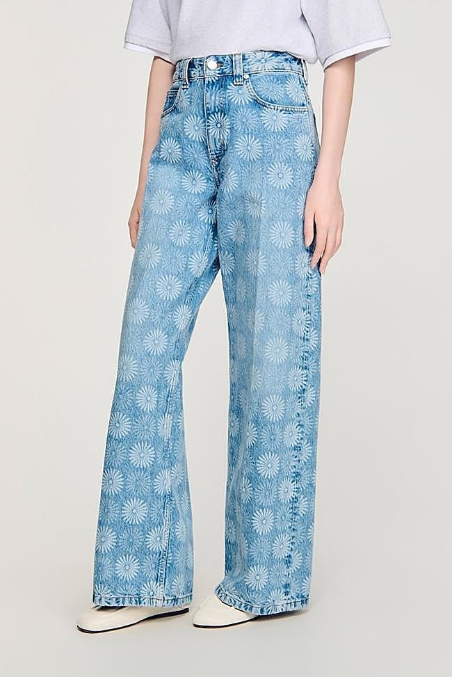 Pantalón vaquero, de corte ancho en la pierna, con estampación de flores en color rosa y un diseño de cinco bolsillos. Precio: 119 euros.