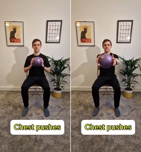 Siéntate en la silla con la espalda recta y las piernas separadas a la anchura de las caderas. Sujeta la pelota con ambas manos y llévala hasta el pecho. Activa el abdomen antes de comenzar. Desde esa posición, estira los brazos al frente de forma lenta y controlada, como si fueras a entregarle la pelota a alguien que tienes enfrente.