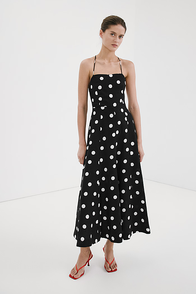 Este es un vestido midi de tejido crepé de color azul marino con estampado de puntos mini de color blanco. Tiene un diseño favorecedor con escote pico y tirantes anudados y es de corte fluído. Precio: 74,95 euros.