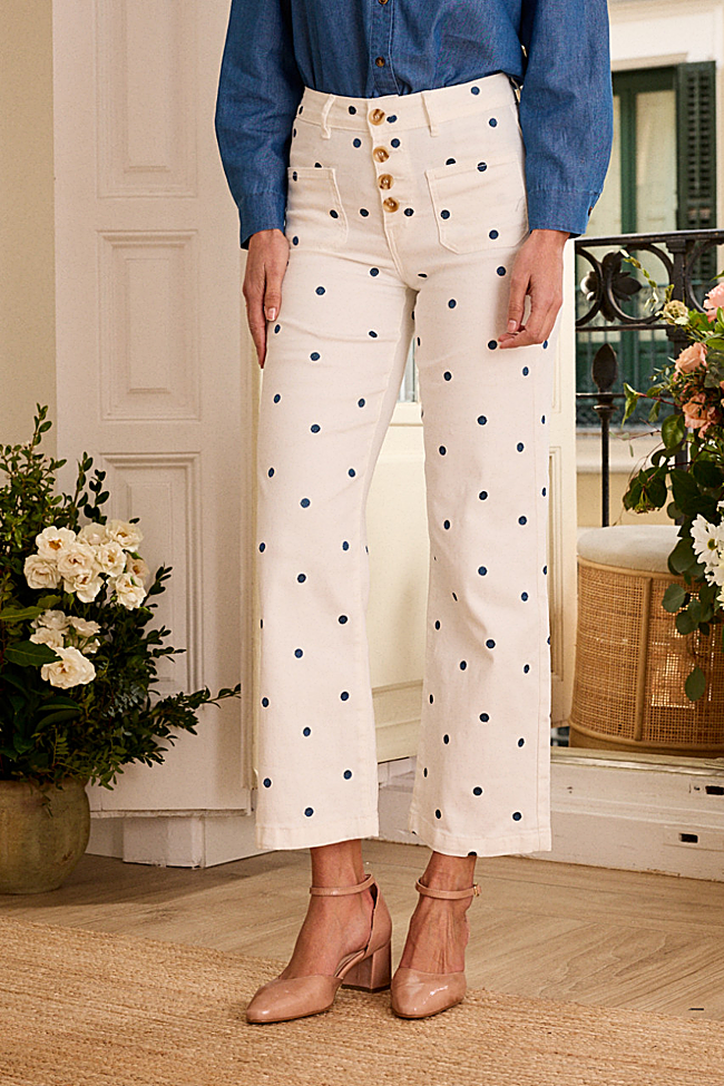 Pantalón vaquero en color crudo de corte recto y diseño de tiro alto con cierre abotonado. Adornado por un bordados de lunares en color azul denim lo que aporta un toque femenino y romántico. Precio: 59,95 euros.
