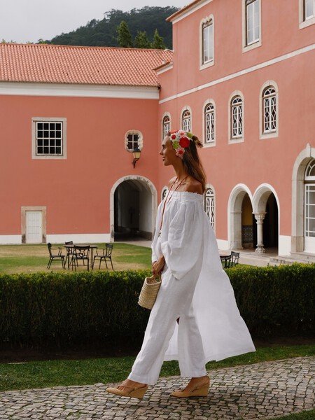 Unos pantalones blancos siempre serán un comodín cuando llegue el buen tiempo que combinan con todo nuestro armario. En esta propuesta, la influencer Lucia Barcenas los combina con una blusa oversize y unas alpargatas que suman algunos centímetros al look. Un outfit con detalles muy naturales como el bolso tipo cesta efecto rafia. Este modelo de El Corte Inglés es el mejor ejemplo y queda genial para recrear este conjunto.