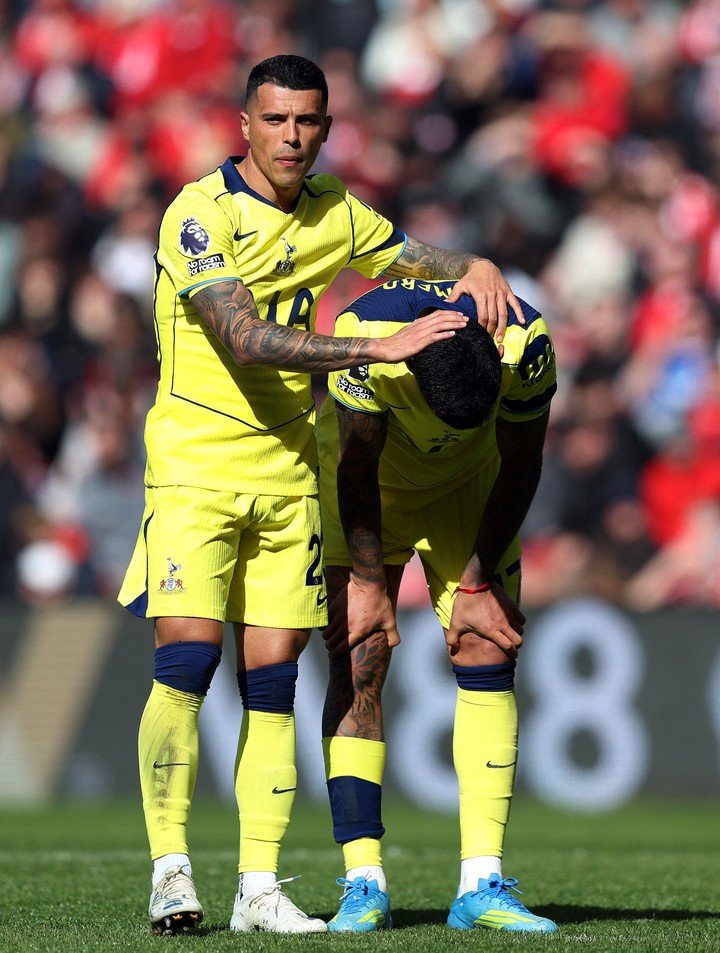 Cristian Romero es consolado por Pedro Porro atras la lesión.Cristian Romero es consolado por Pedro Porro atras la lesión.