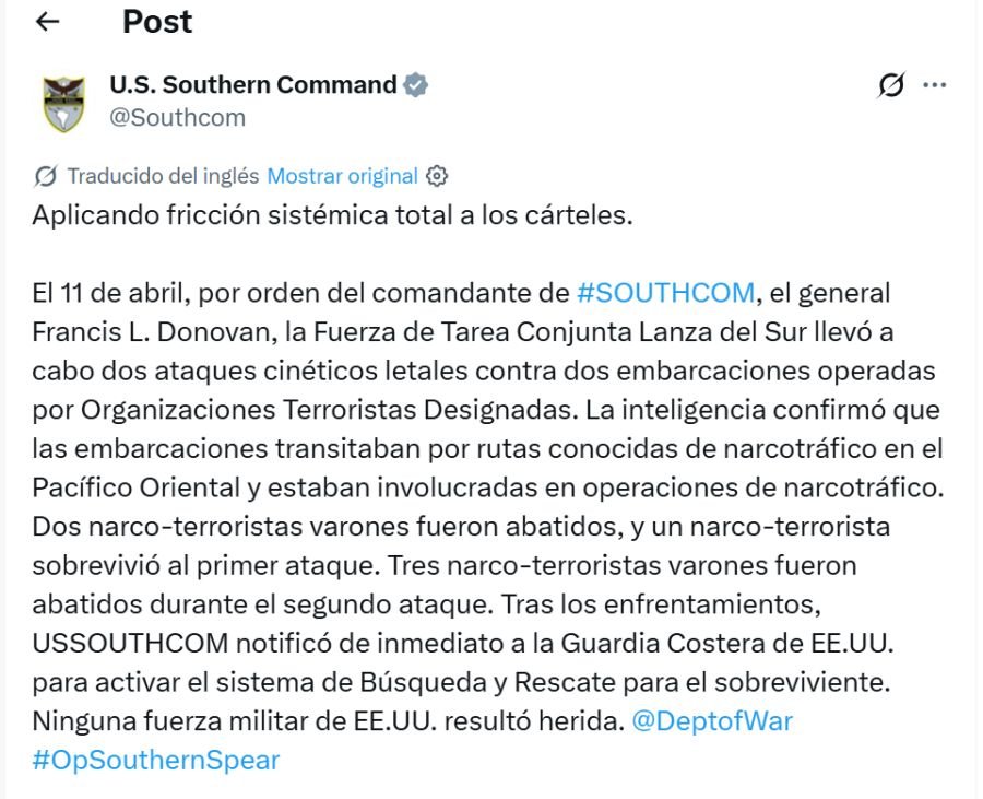 «La Fuerza de Tarea Conjunta Lanza del Sur llevó a cabo dos ataques cinéticos letales contra dos embarcaciones operadas por Organizaciones Terroristas Designadas», afirmó el Comando Sur (SOUTHCOM) del Ejército estadounidense a través de un posteo en su cuenta de la red social X. Aseguró que estaba confirmado por fuentes de inteligencia que las embarcaciones estaban involucradas en operaciones de narcotráfico en el Pacífico Oriental.