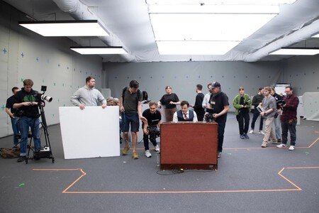 Según puede verse en las imágenes compartidas por el medio, en lugar de fondos completos o chromas tradicionales, había paredes con cruces sobre ellas que serán rellenadas con IA en posproducción. No obstante, lo más llamativo es la ausencia de iluminación tradicional, con focos de un tamaño considerable bañando de luz plana y uniforme todo el set. Ni trípodes, ni cables, ni rigs complicados para buscar expresividad en plató: todo se iluminará a través de la IA.
